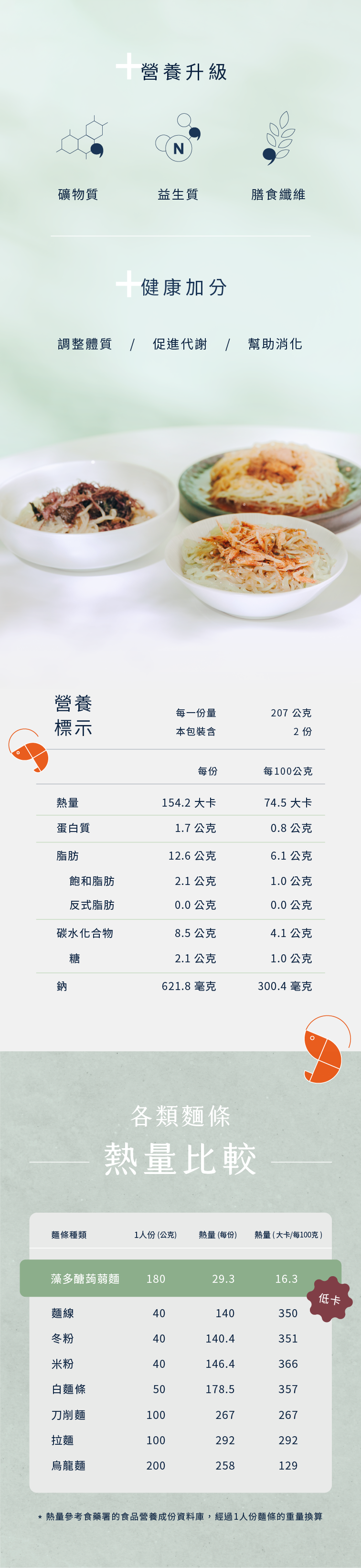 成份:【麵體】水、蒟蒻精粉、多醣藻藍萃取液 (海木耳多醣萃取液、螺旋藻萃取液)、食用氫氧化鈣 (凝固用)