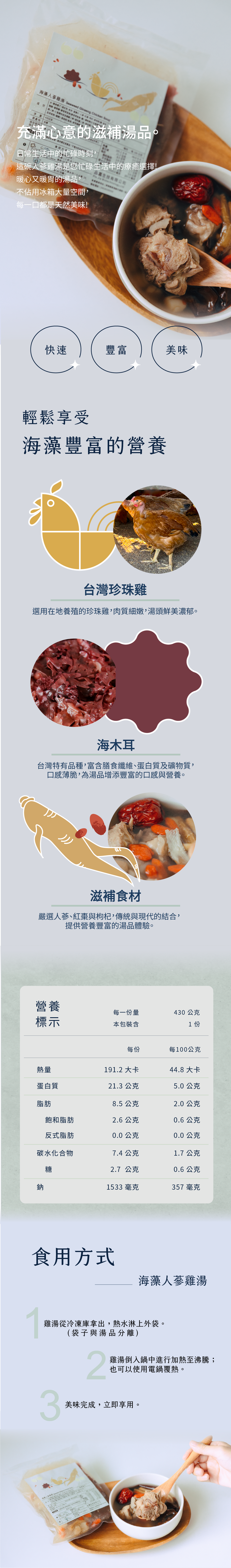 成份:水、雞骨腿丁、海木耳、珠貝、當歸片、人蔘、紅棗、枸杞、鮮味粉(鹽、麥芽糊精、葡萄糖、酵母萃取物(酵母萃取物、鹽)、調味劑(5'次黃嘌呤核苷磷酸二鈉、5'鳥嘌呤核苷磷酸二鈉、琥珀酸二鈉、琥珀酸)、糖、香菇精粉(香菇萃取物、糊精)、香菇粉(香菇;麥芽糊精、鹽)、棕櫚油、玉米糖膠)、鹽