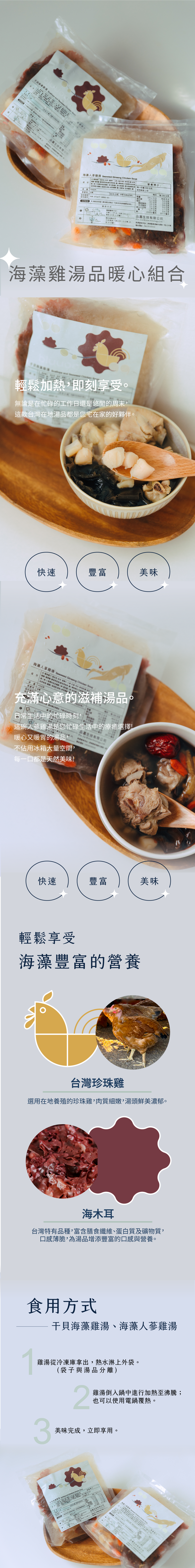 湯中有肉質鮮美的珍珠雞肉,搭配台灣特有海藻,以及鮮美的干貝,